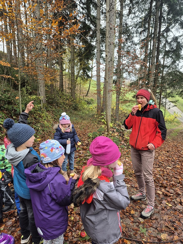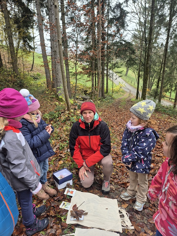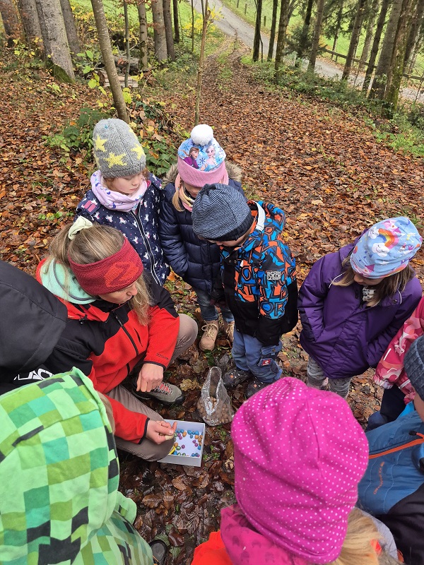 Am 5.November fand der Waldtag der ersten Klasse statt. Die Waldpädagogin Verena Nadlinger marschierte mit den Kindern in den Wald. Die Kinder hatten viel Freude und Spaß bei verschiedenen Suchaufträgen im Wald. Zum Abschluss versteckten sie Eicheln im Wald, die sie anschließend von ihrem Kobel aus, wie die Eichhörnchen im Winter wieder suchen durften.